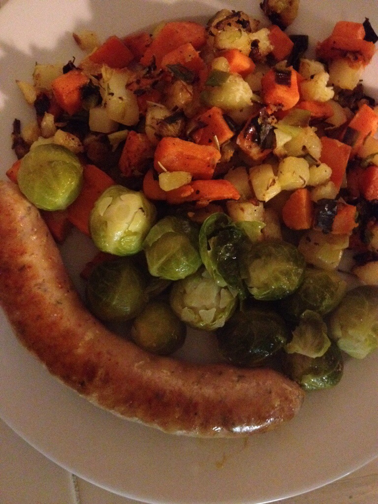 „Deutsches“ Abendessen: Bratwurst von einer französischen Fleischerei im Dogpatch, Bratkartoffeln (normale und Süßkartoffeln) und Rosenkohl.