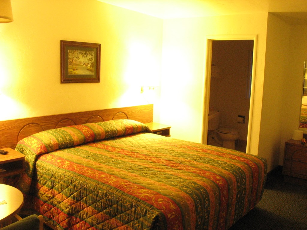 Und so sehen die Zimmer von innen aus, riesiges Bett, Tisch, Stühle. Sideboard, Kühlschrank, Kaffeemaschine und Fernseher sind auch da.