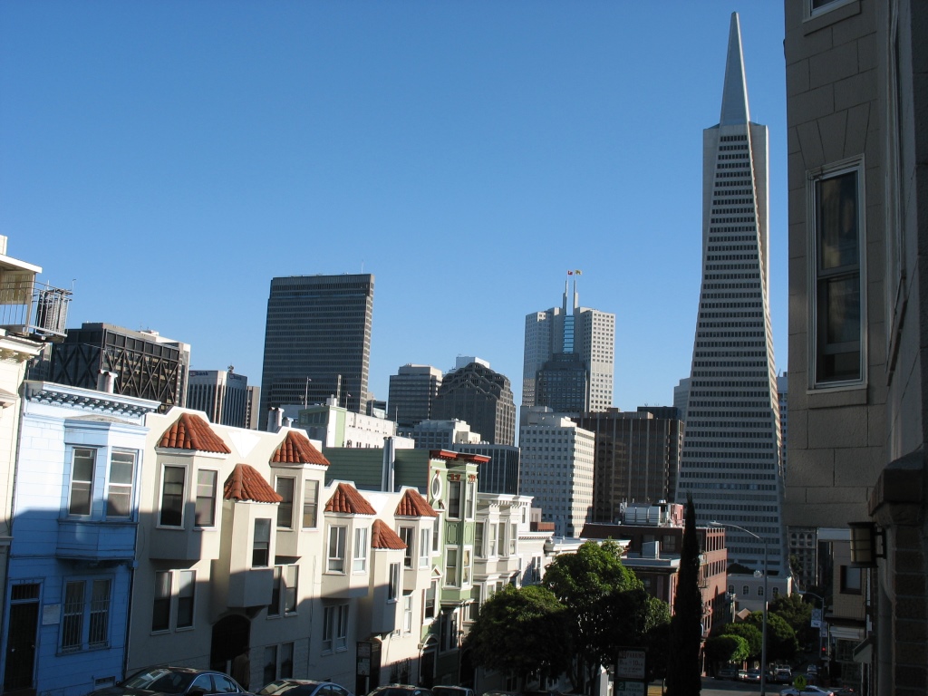 Blick auf die Häuser im Stadtteil Telegraph Hill und gleichzeitig hinunter nach Downtown und die Transamerica Pyramid, das Wahrzeichen von San Francisco.